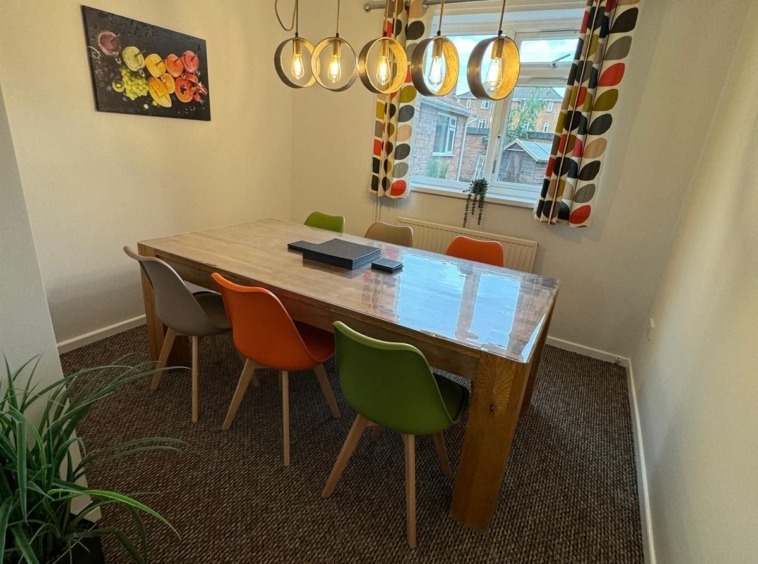 Separate dining room with a full-size dining table and seating for six – ideal for shared meals and study sessions.